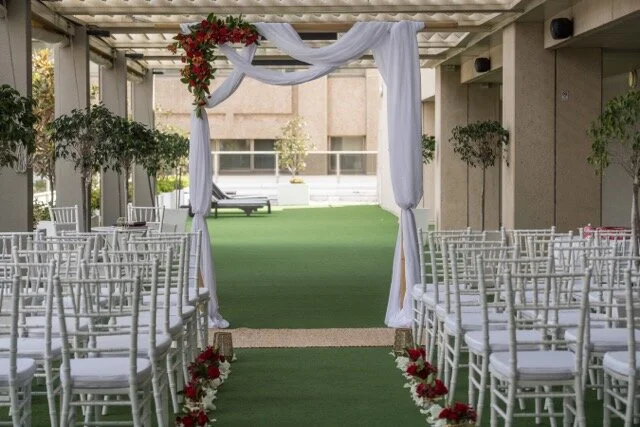 The Ceremony was held at the Soiree Deck, Sofitel Brisbane Central. Stunning red blooms lined the aisle and arbour.